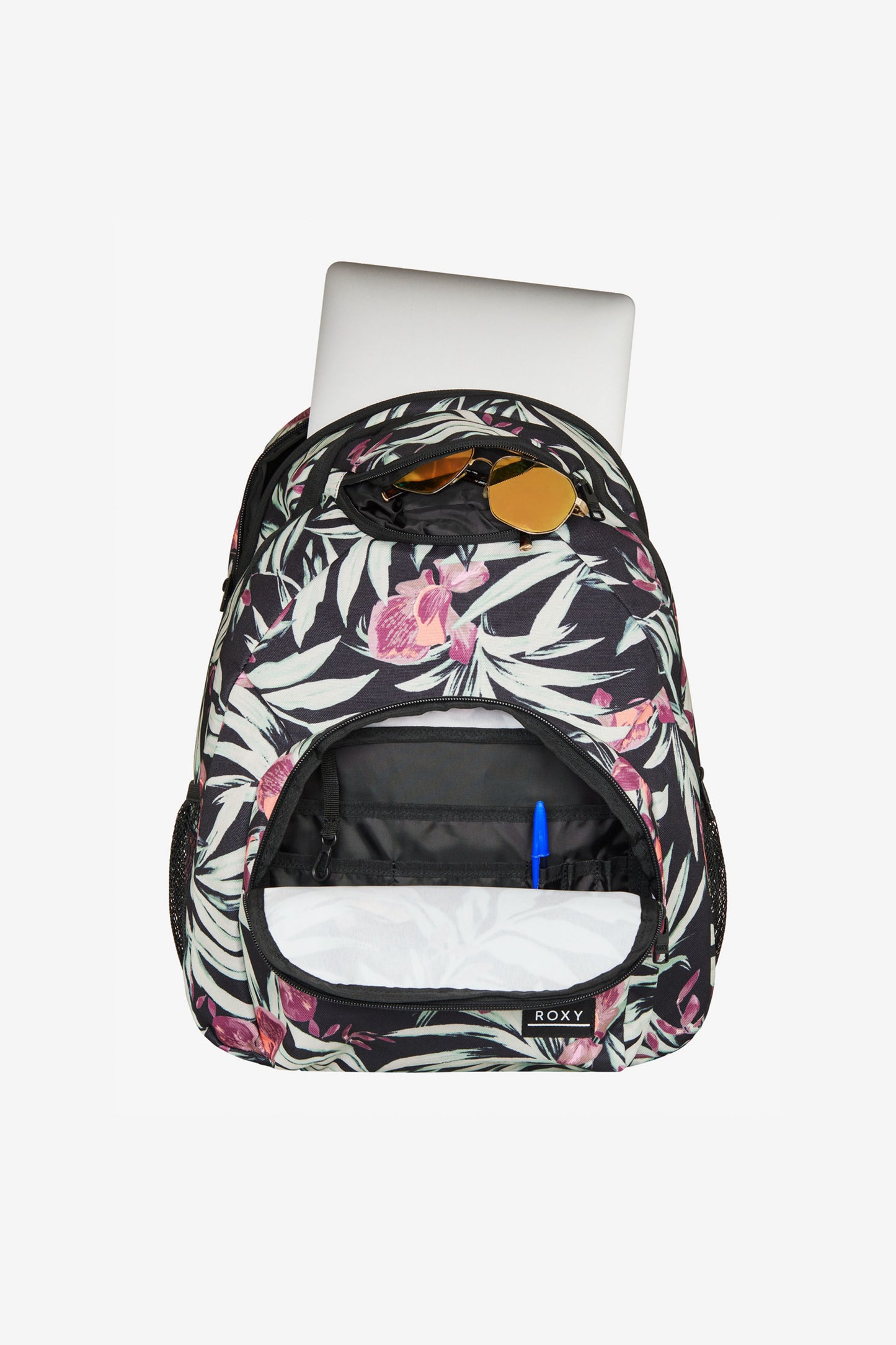 A 24-L everyday backpack crafted with durable recycled 600D/150D polyester in a bold Wind Swept Floral print. It features two zippered main compartments, a padded laptop sleeve, sunglasses pocket, side bottle pockets, padded adjustable straps and a reinforced base for all-day comfort and function.