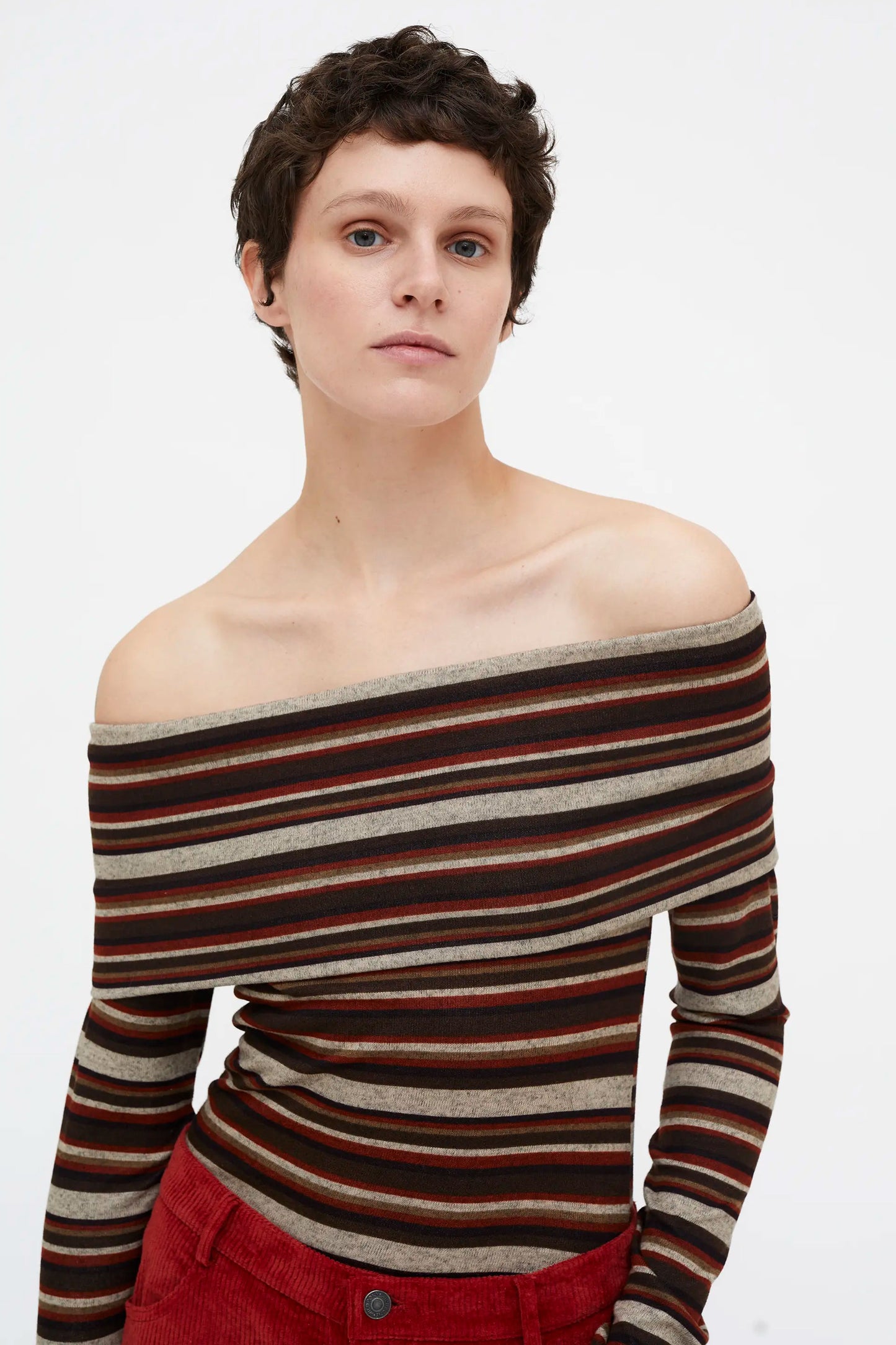 Light up your summer days in vibrant stripes that move with you—this multicolored jersey top blends bold colors and clean lines for a joyful, eye-catching look. Strapless design with long sleeves at the back adds a twist you'll want to style again and again.