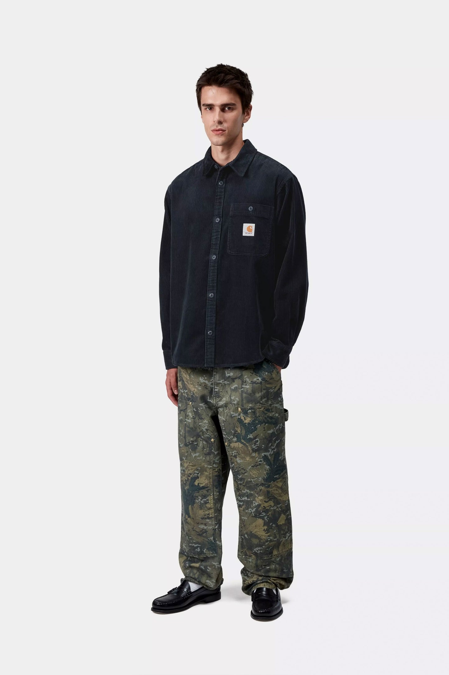 This long-sleeve Flint Shirt combines rugged function with utility style. Crafted in heavy 8-wale cotton corduroy that’s garment washed for a softer hand, it features a curved hem, button-front closure, and chest pocket with a woven square label. With its relaxed fit, it’s ideal for layering over tees or under jackets.