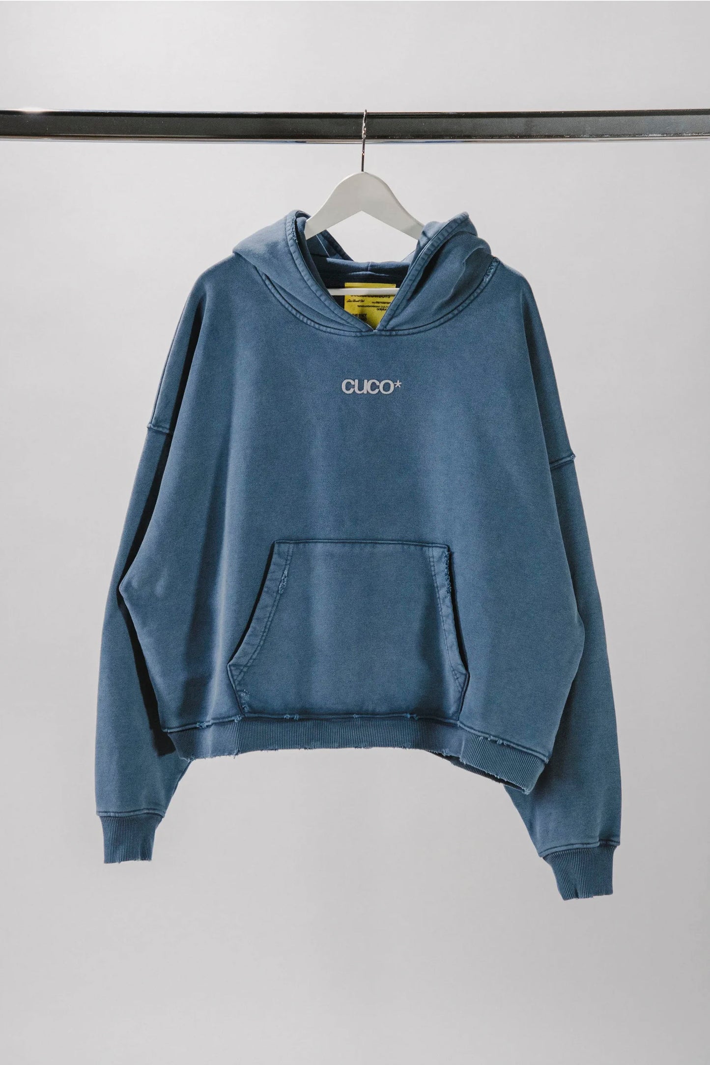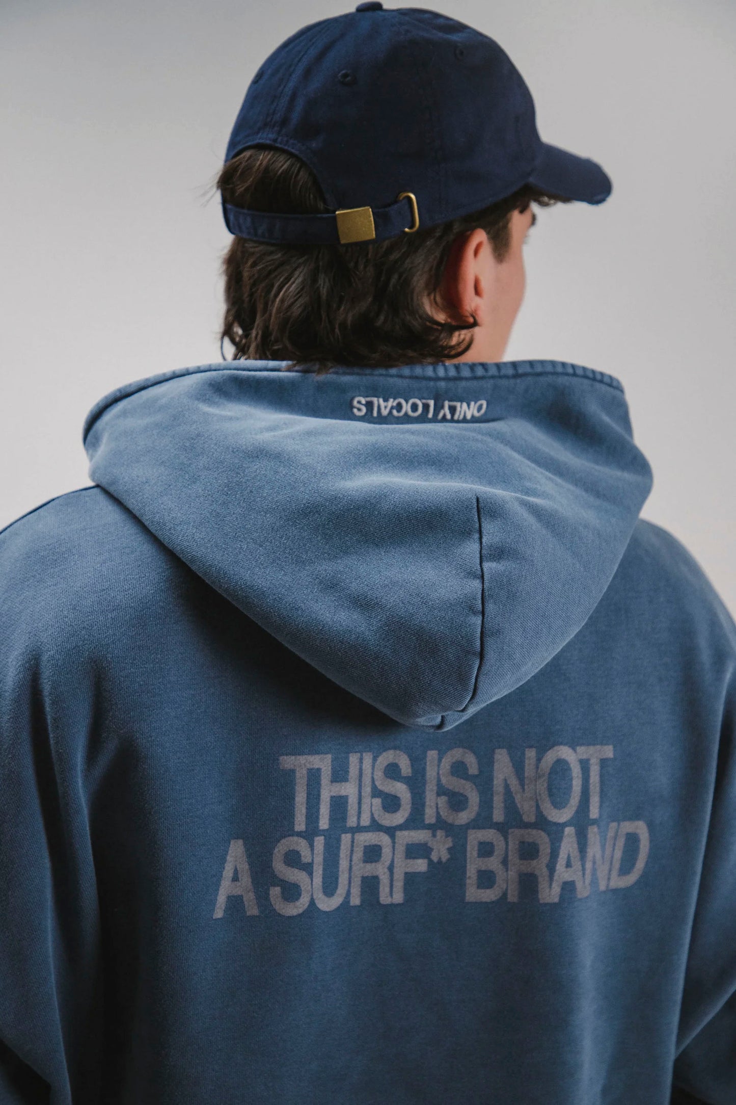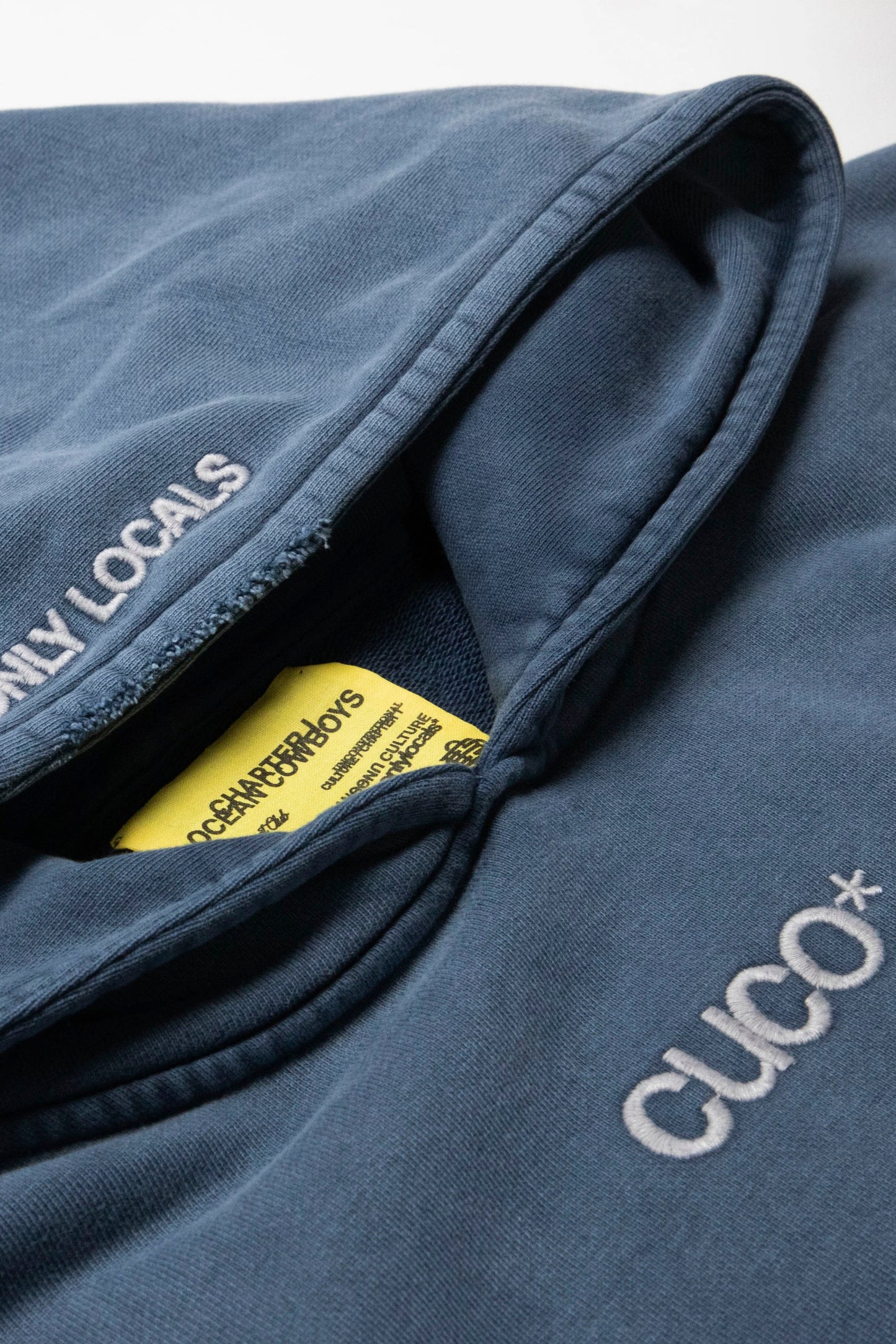 Cut cropped and boxy from 500gsm 100% cotton with a loopback diagonal French terry interior—dense, breathable, built to last. Garment-dyed to a washed blue, it features a clean chest hit (CUCO*), kangaroo pocket, and "ONLY LOCALS" hood detail. The back carries the statement: THIS IS NOT A SURF BRAND*. Tone-on-tone twin-needle finishes and light sleeve distressing complete the piece.