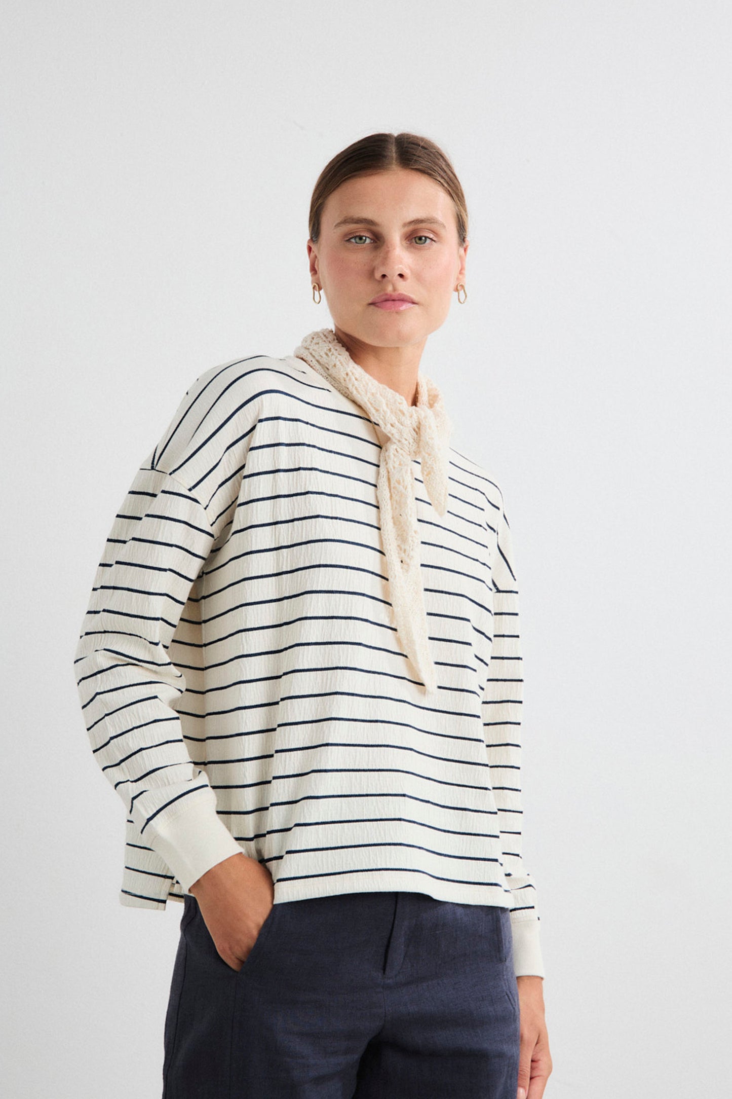 A timeless marinière sweatshirt that brings coastal ease to your everyday wardrobe. Crafted with ribbed collar and cuffs for structure and comfort, this classic piece transitions effortlessly through the seasons. Your go-to for laid-back, nautical-inspired style.