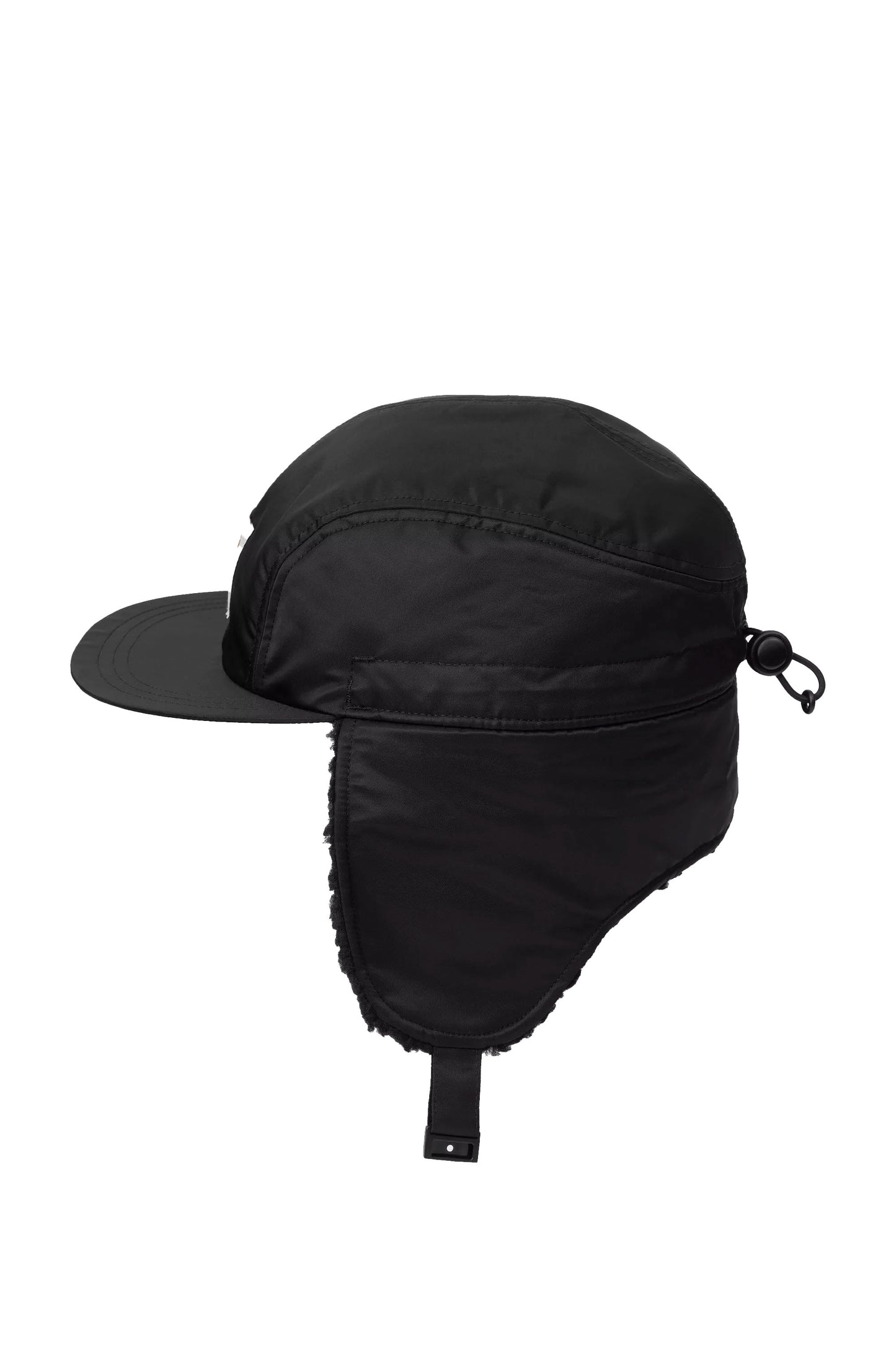 A sleek black cap with fold-down ear guards and mid-weight nylon fabric built for crisp mornings or layered streetwear in cooler climates. The adjustable clasp keeps it practical while the four-panel silhouette brings understated style to any outfit.