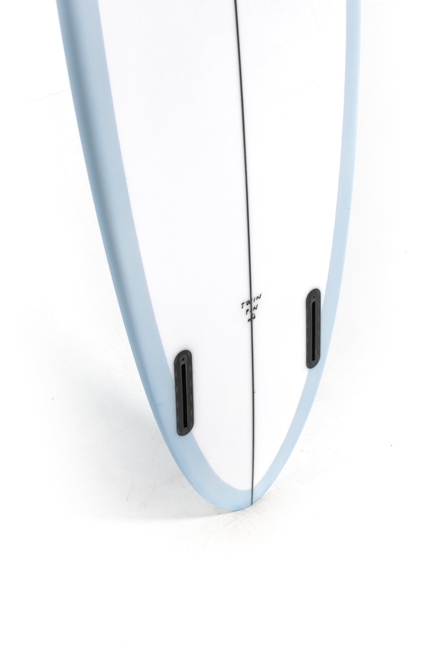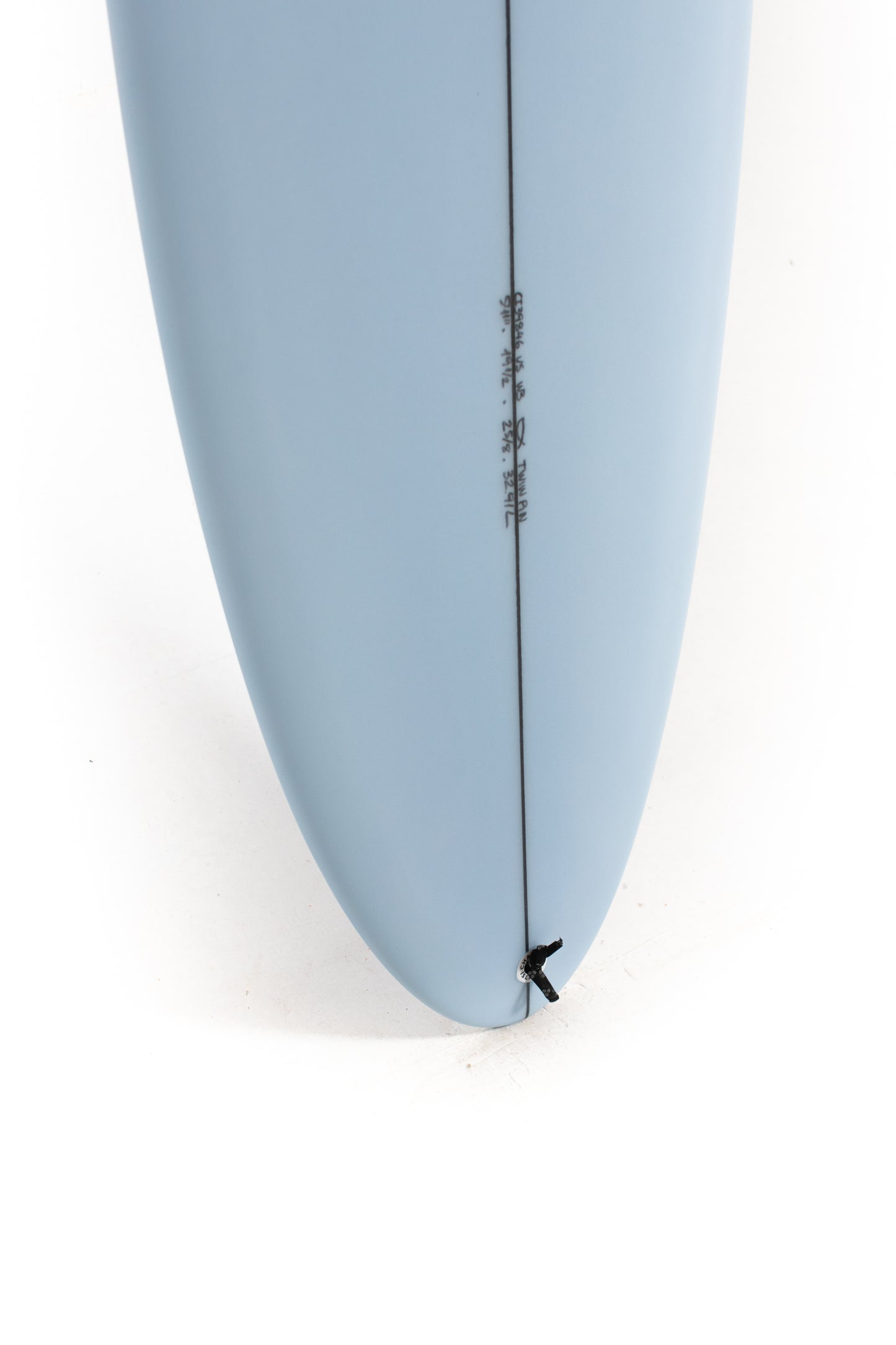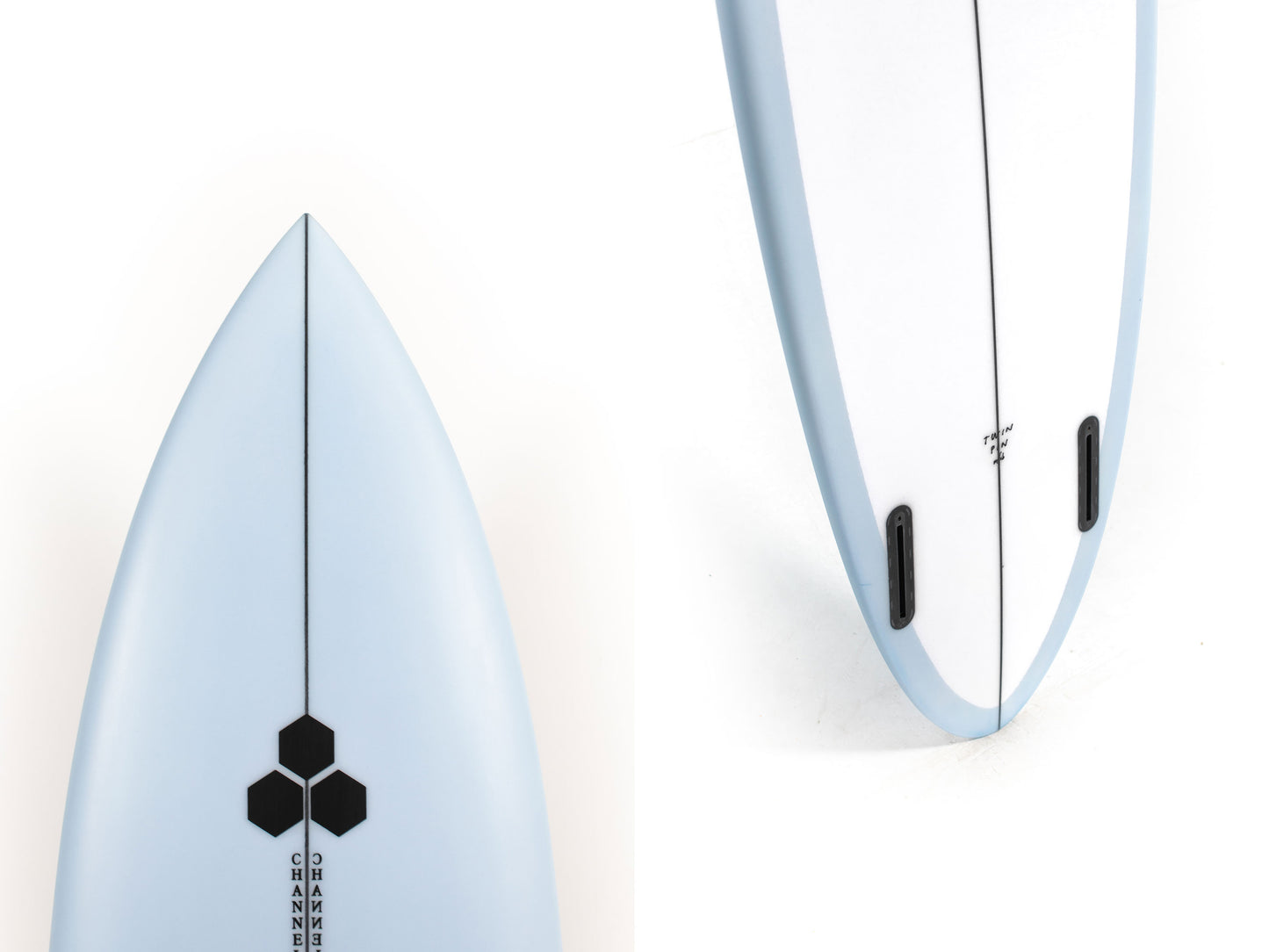 Most people ride the Twin Pin at least ⅛” thicker than their shortboard since the rails are low. Britt designed a hand foiled signature twin fin set to fit between a keel and upright fin to best perform with this CI Twin Pin providing the right balance of drive, hold and maneuverability, and flow.