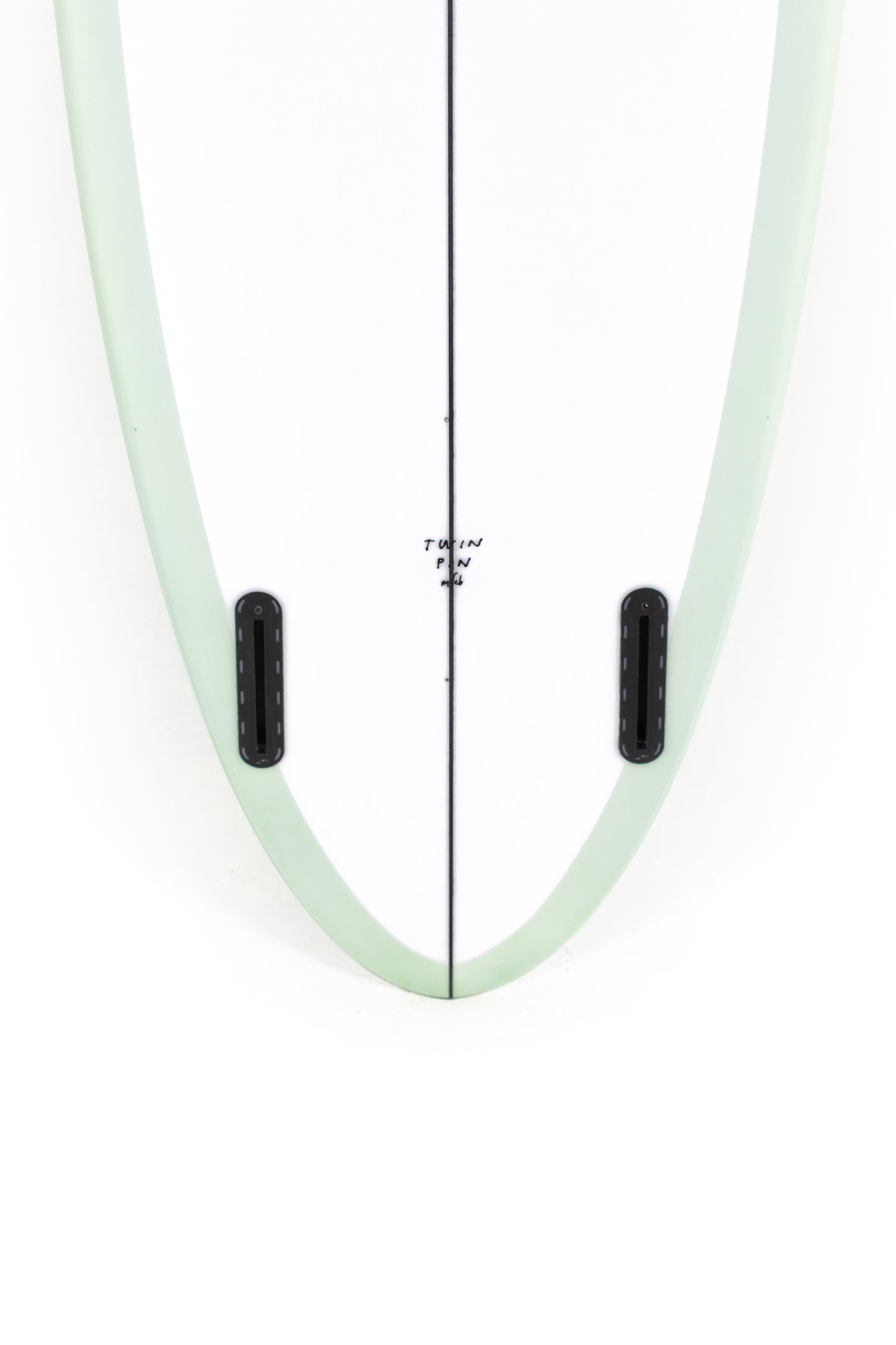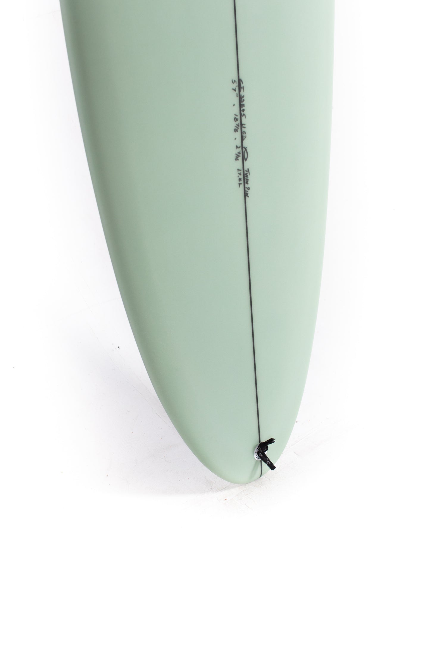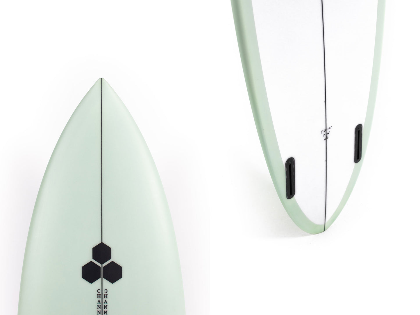 Most people ride the Twin Pin at least ⅛” thicker than their shortboard since the rails are low. Britt designed a hand foiled signature twin fin set to fit between a keel and upright fin to best perform with this CI Twin Pin providing the right balance of drive, hold and maneuverability, and flow.