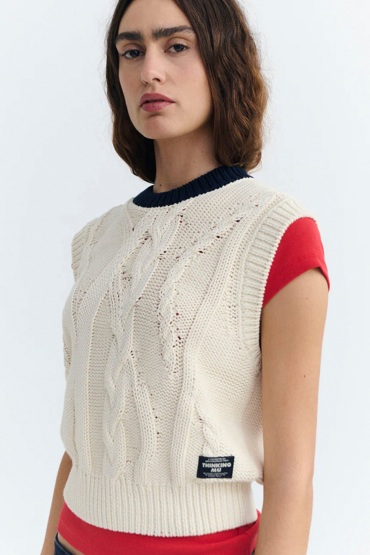 The Aria Knitted Vest brings timeless versatility to your wardrobe. Crafted from organic cotton with a distinctive braided knit texture, this sleeveless piece layers beautifully over tees and shirts for an elevated, relaxed look.