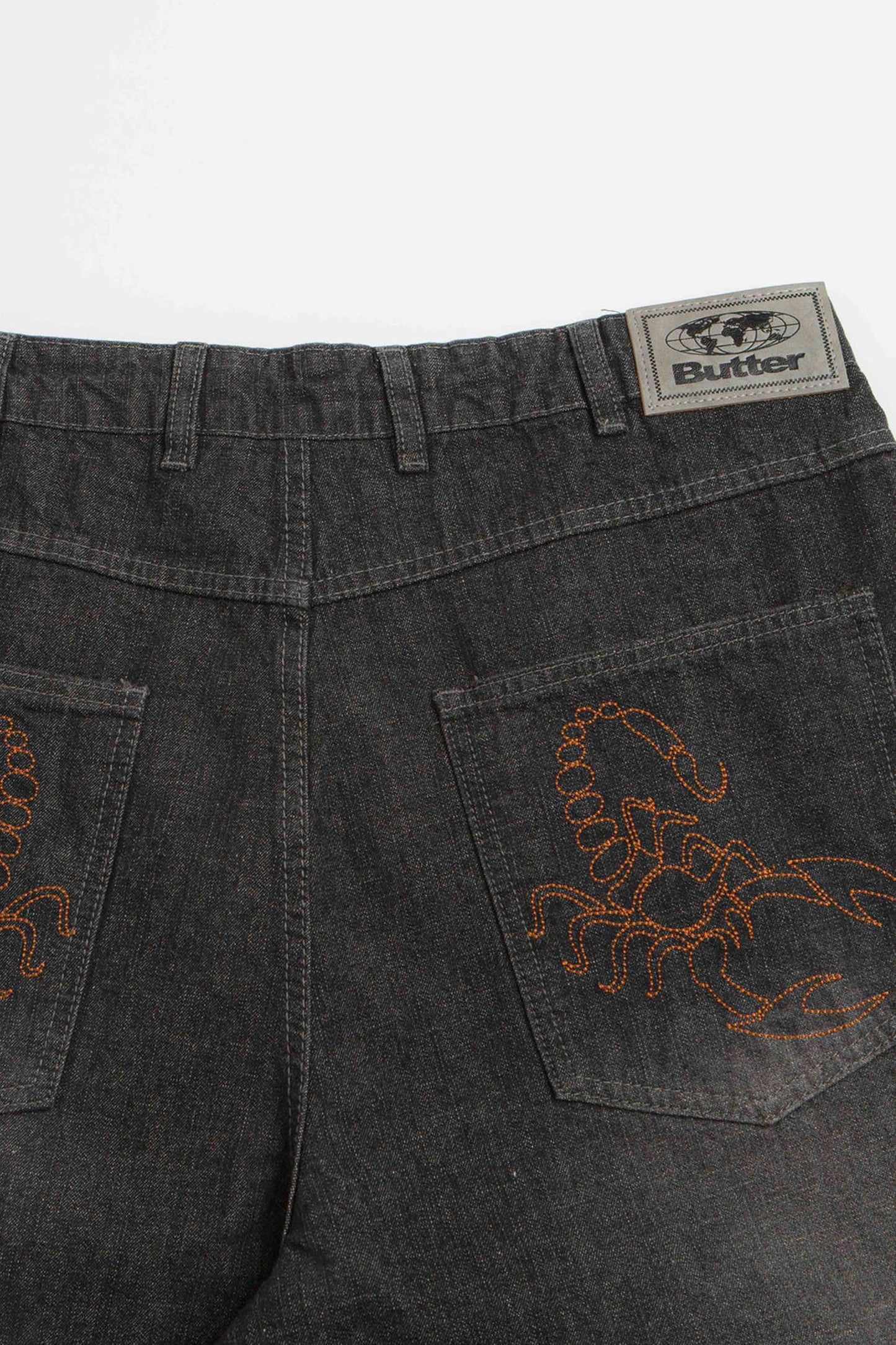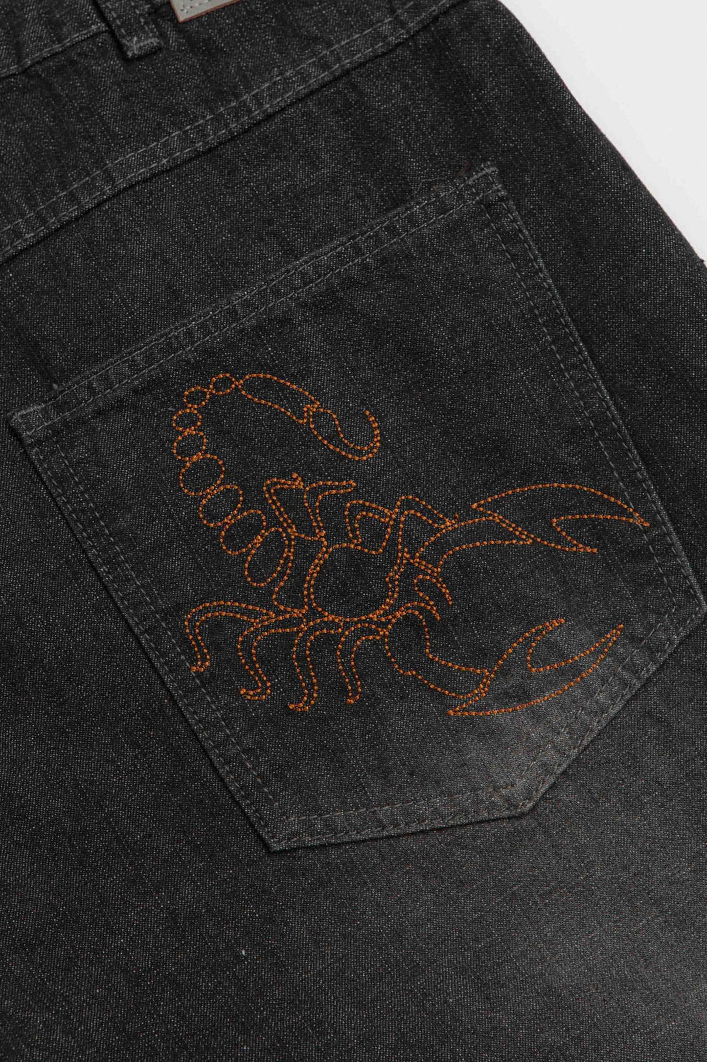 The Scorpion Stitch Denim Jeans in slub black showcase intricate detailing and premium construction. Featuring signature scorpion stitching and a textured slub fabric, these jeans bring bold character to your denim collection—designed for those who appreciate the finer details.