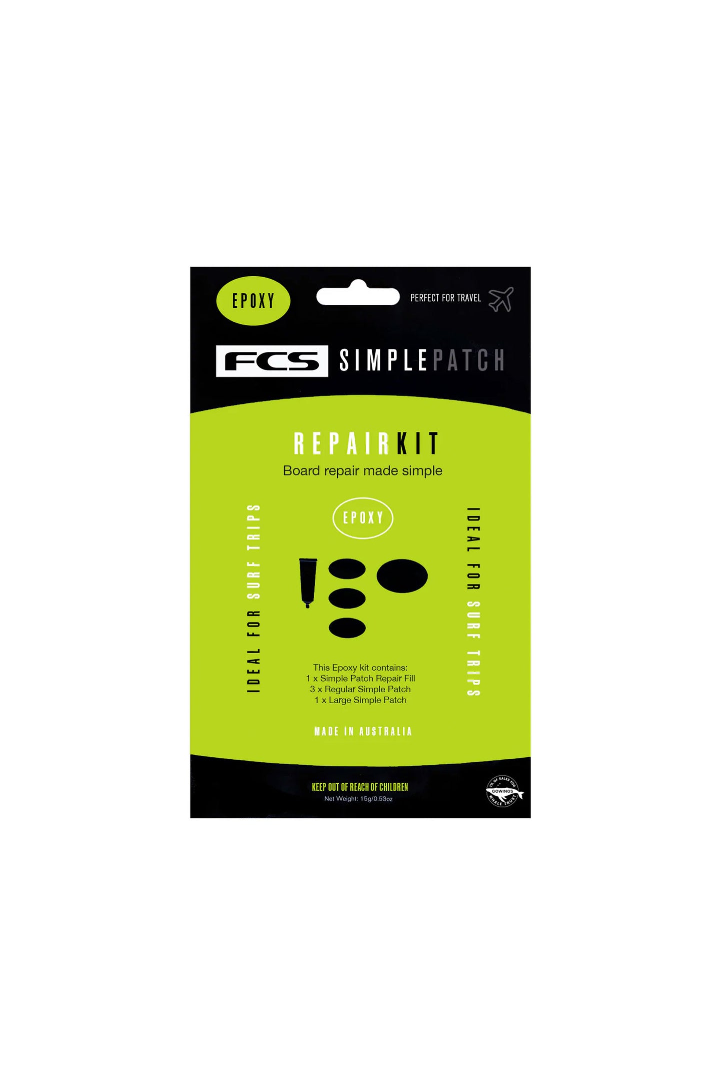 Value Pack – Perfect for 5 – 6 repairs, ideal for any surf trip. Includes: 1 x SimplePatch Large, 3 x SimplePatch Regular, 1 x SpeedFill.