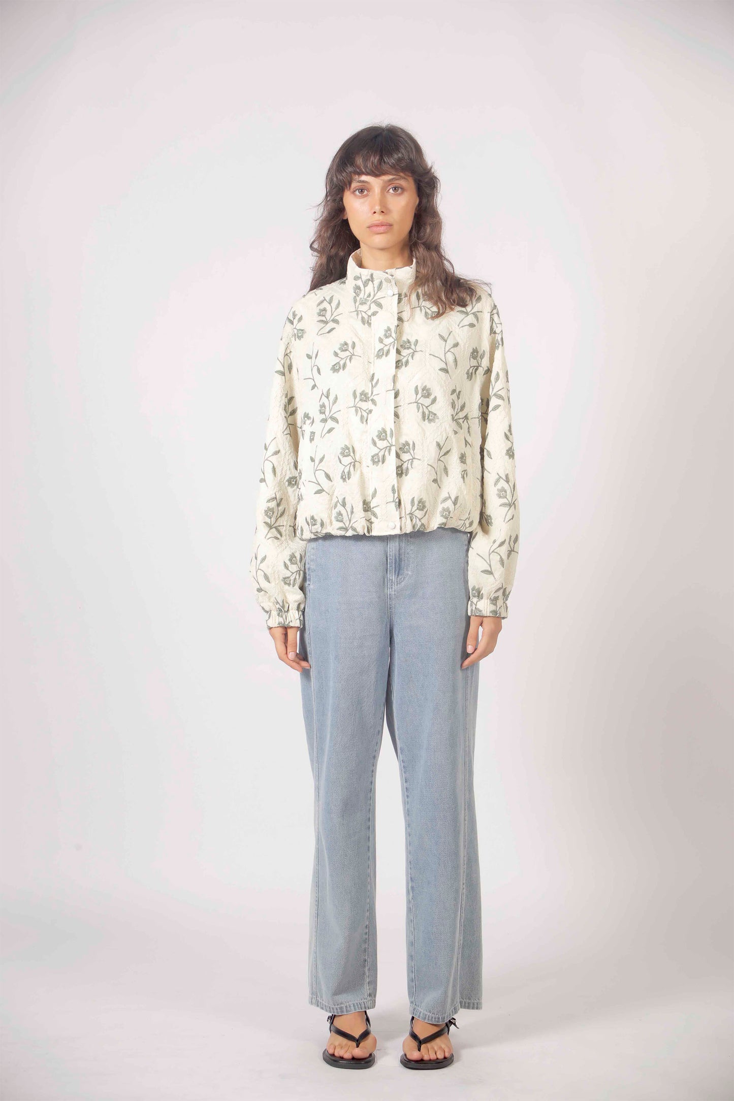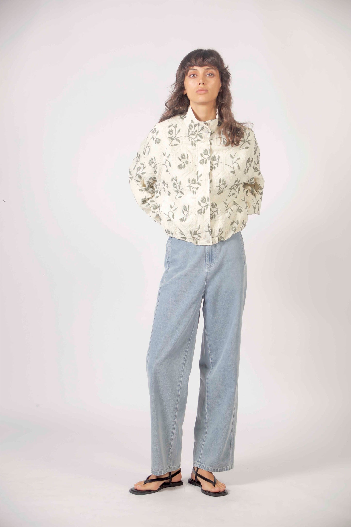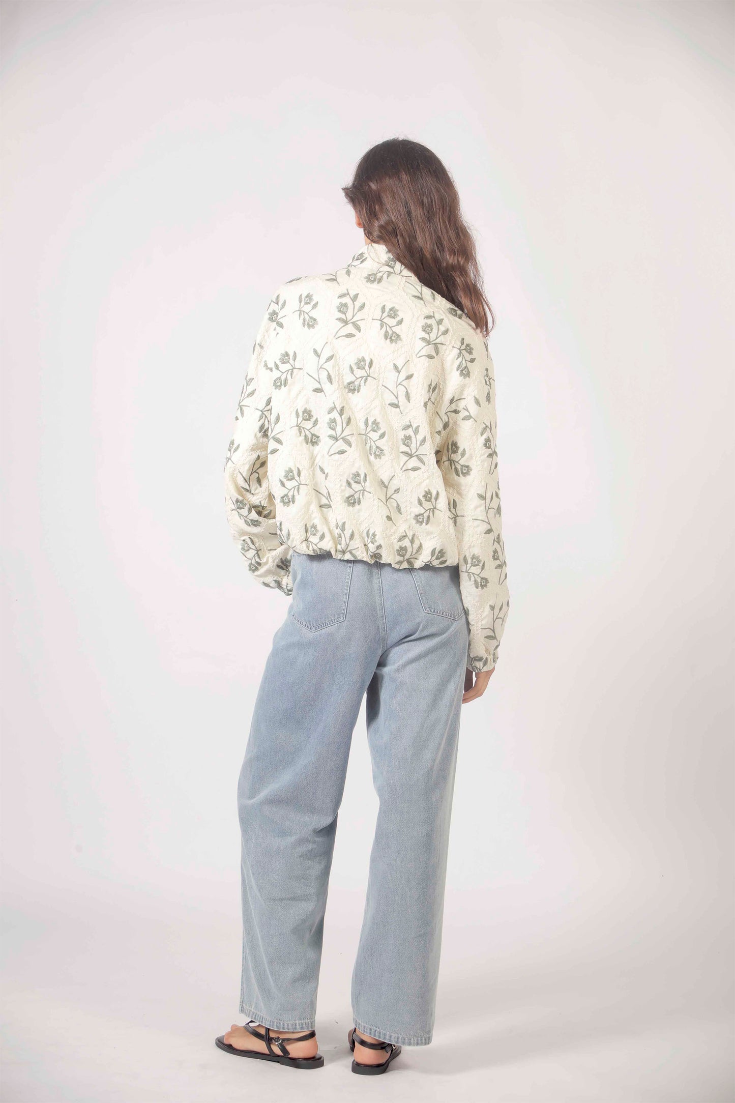 A lightweight jacket in aqua adorned with delicate floral embroidery, crafted for those who appreciate refined details. The relaxed silhouette and artisanal touches make it the perfect layering piece for cool coastal evenings and transitional days.