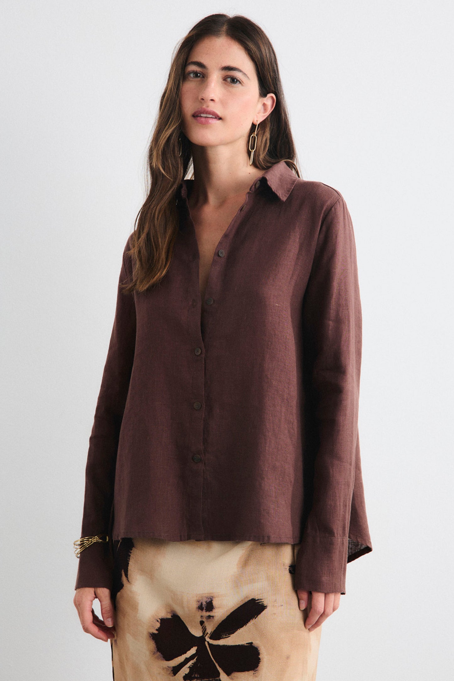 A brown linen shirt that brings refined versatility to your wardrobe. Designed with a classic collar, button-front closure, button cuffs, and a back yoke with pleat, it features a hidden side button that allows you to wear it wrapped for a sophisticated, tailored silhouette. Pair it with the Aurora pants for a complete look.