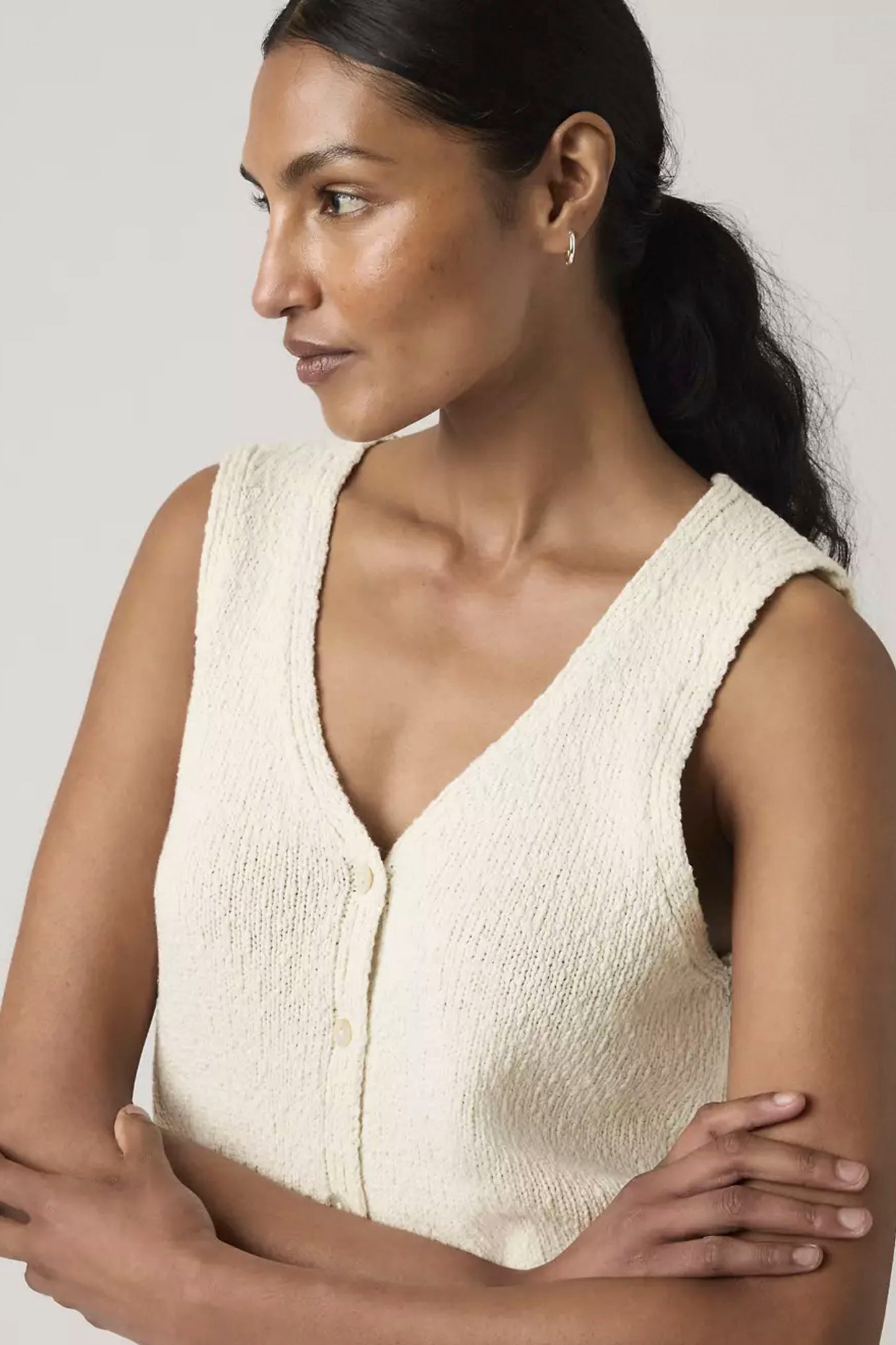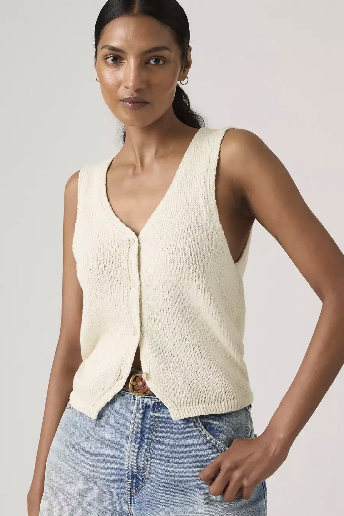 A classic standard-fit vest crafted from soft, textured bouclé fabric. The perfect layering piece that adds dimension to any outfit, whether paired with high-waisted denim or worn over your favorite tee for effortless everyday style.