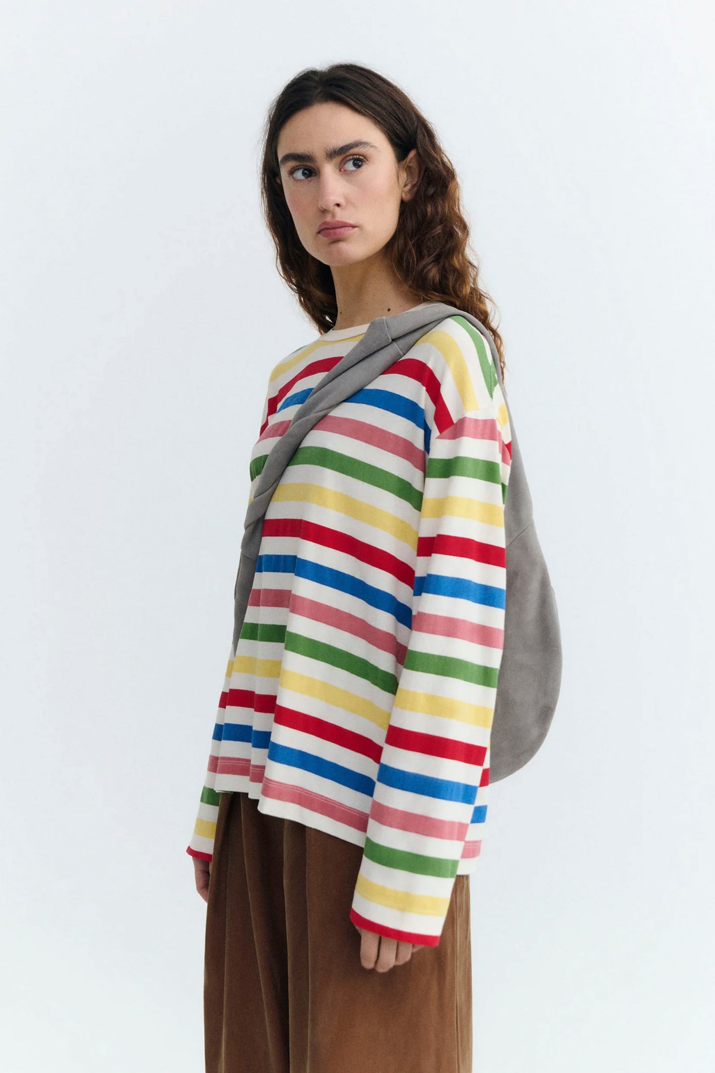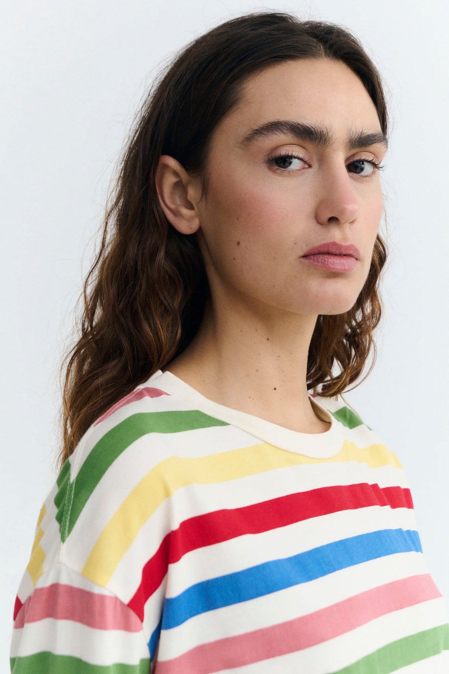 The Emily Tee in Mediterranean stripes brings relaxed sophistication to your wardrobe. This long-sleeve crew neck features an oversized fit and extended length, perfect for layering or wearing solo on those breezy coastal evenings.