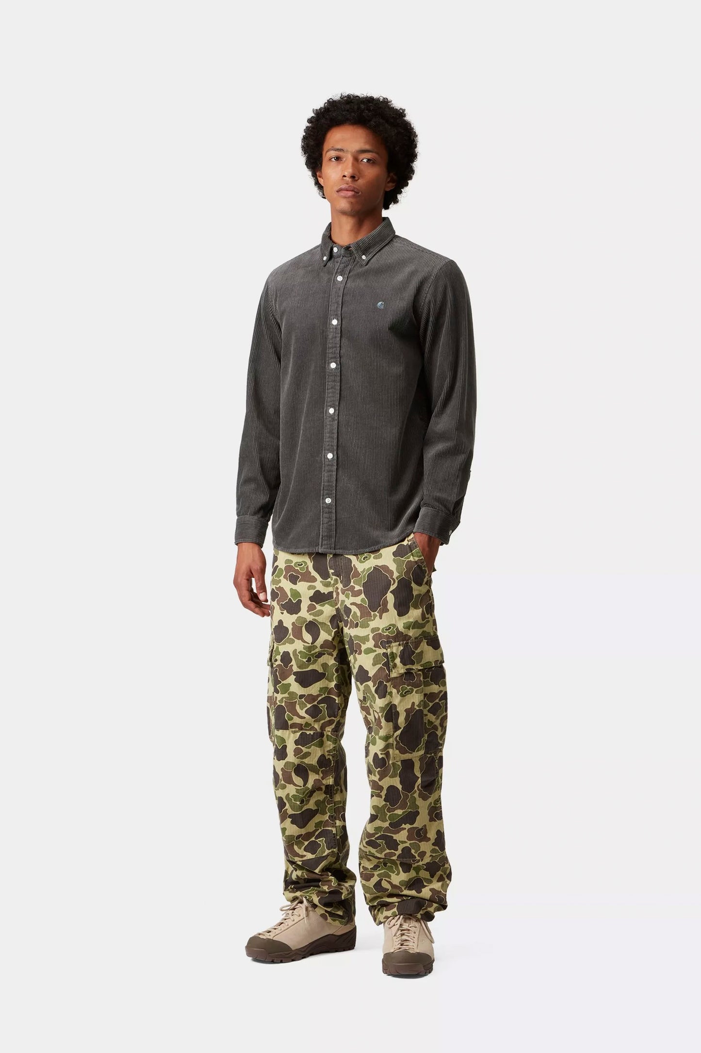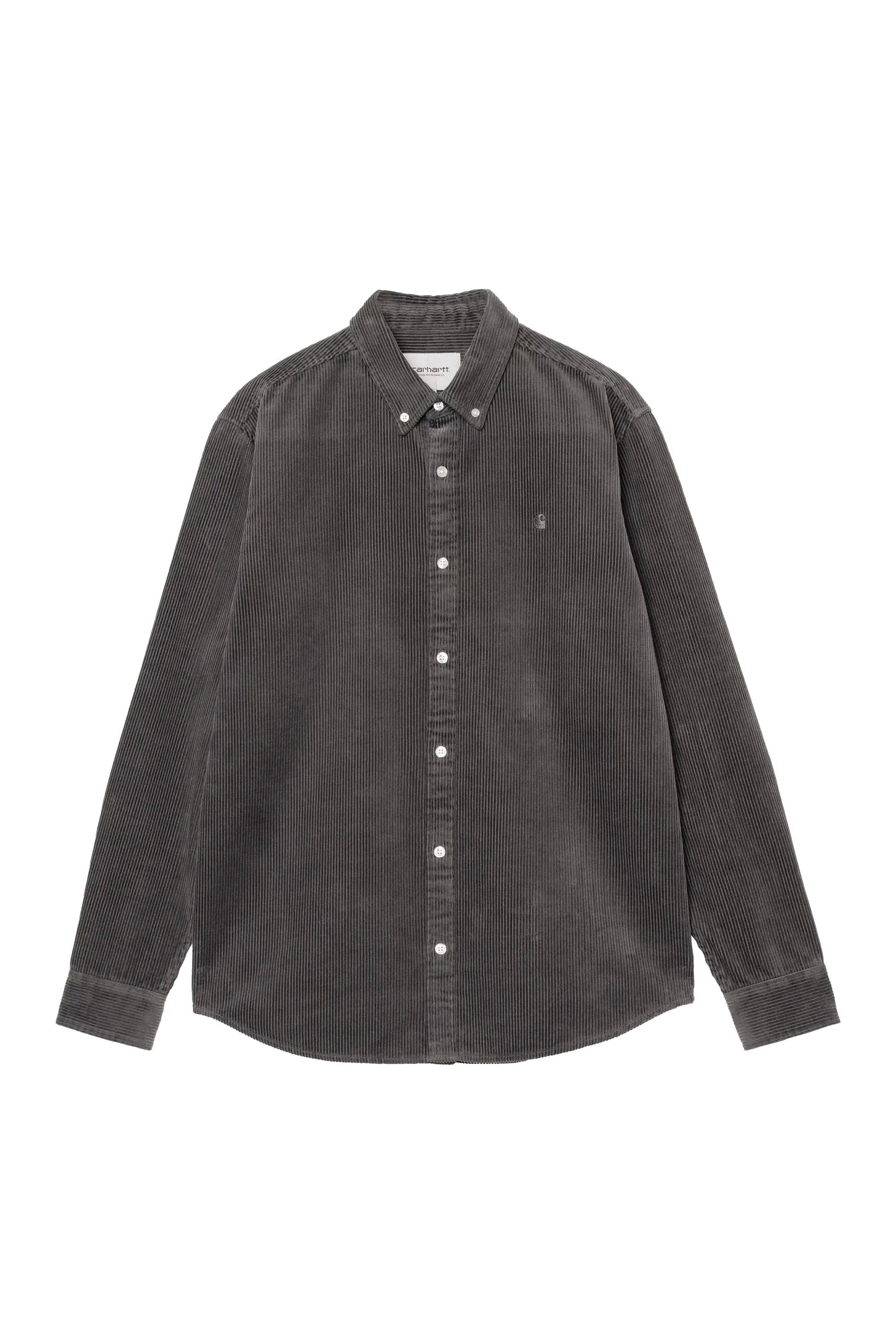 A refined worker-style corduroy shirt in deep graphite that adds texture and depth to any outfit. With a relaxed fit and button-down collar, it’s the ideal layer when the day calls for urban ease and quiet detail.